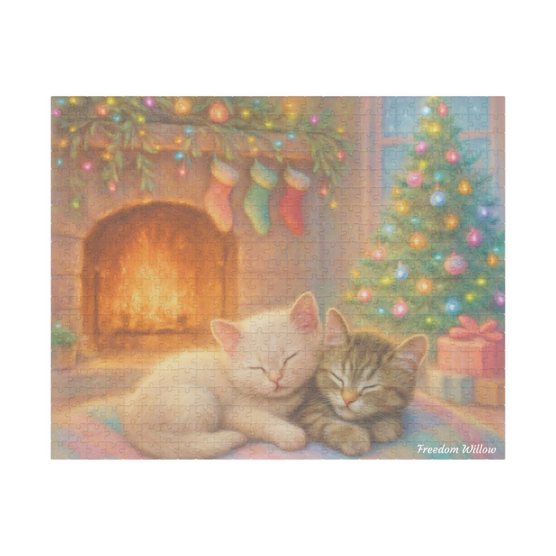 Celebrate the warmth of the season with our Cozy Kittens Christmas puzzle, a heartwarming holiday scene that captures the magic of a peaceful winter night. Two sweet kittens rest together on a soft, cozy blanket by the glow of a crackling fireplace, surrounded by twinkling Christmas lights and a graceful willow-leaf garland draped across the mantle. Stockings hang with care as a sparkling tree shimmers beside the window, where snow falls quietly beyond the glass.