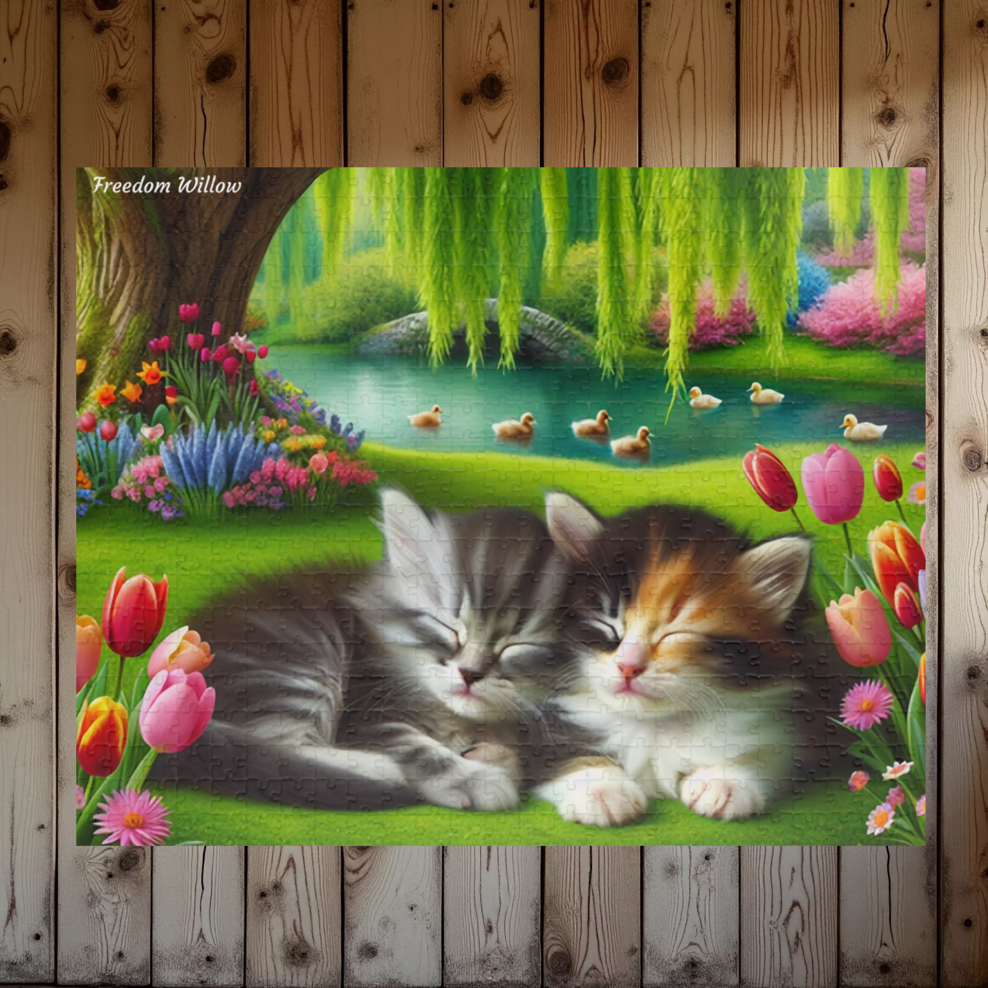 Escape to a relaxing spring scene with this puzzle featuring kittens cuddling in a park full of colorful spring flowers, a tranquil pond with baby ducks swimming by, and a peaceful willow tree.
